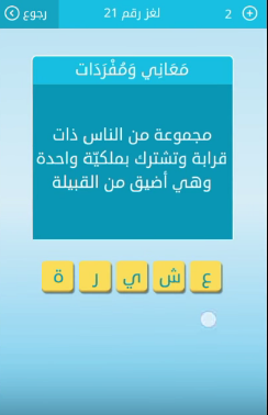 اجابة مجموعة من الناس ذات قرابة وتشترك بملكية واحدة وهى اضيق من القبيلة من لعبة رشفة لغز رقم 21 صقور الإبدآع